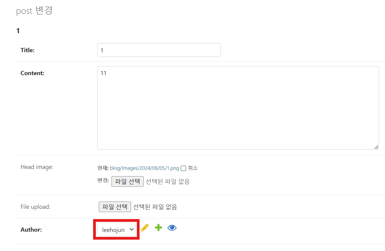 1번을 입력하면 새로운 필드에 대한 기본값을 입력하라는 프롬프트가 나타납니다. 이때 >>> 프롬프트에 1을 입력하면, 데이터베이스의 User 모델에서 ID가 1인 사용자가 모든 기존 게시물의 author로 설정됩니다. 아래 이미지 처럼 Author이 추가된 것을 볼 수 있습니다.