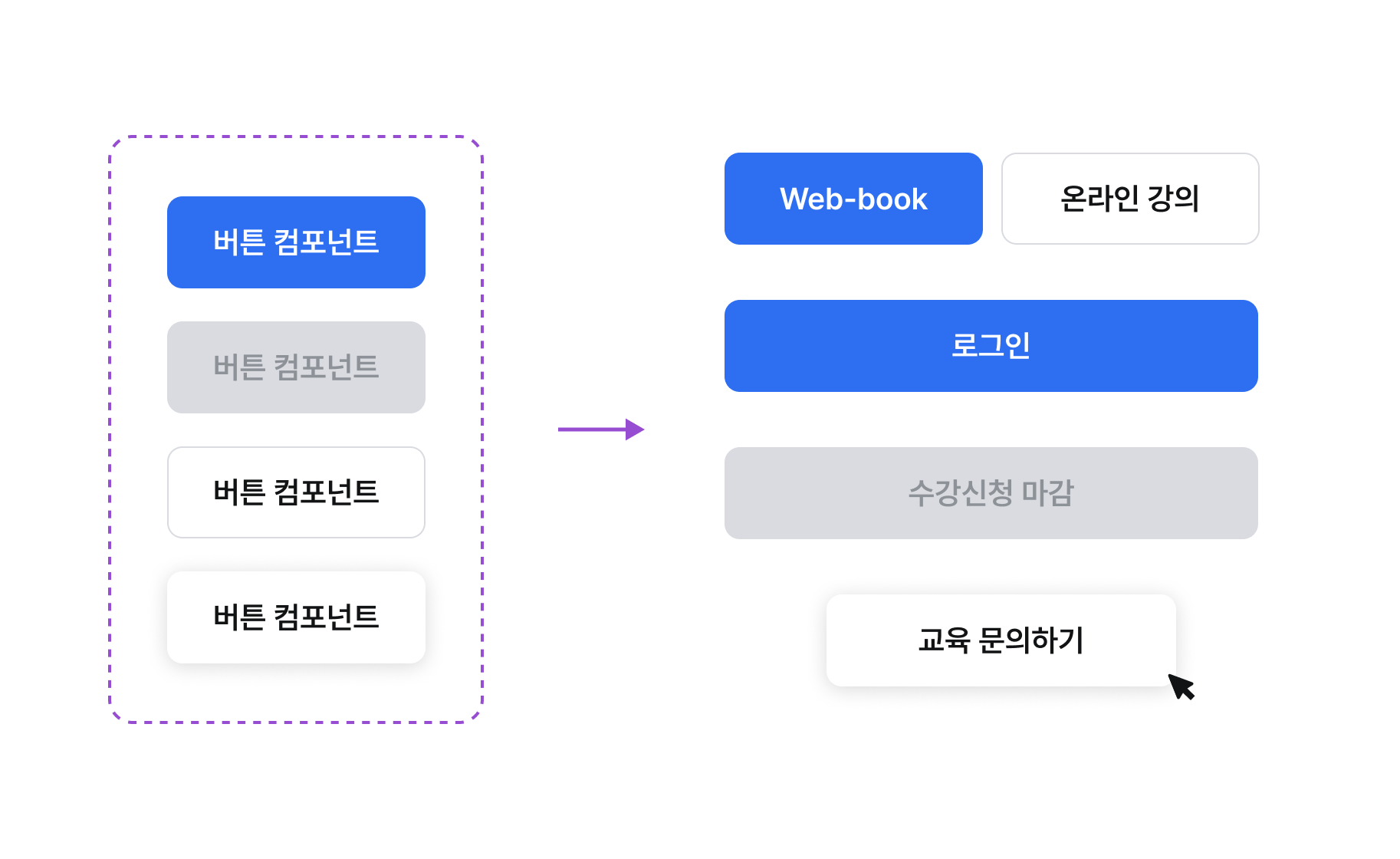 - 버튼 컴포넌트: "확인", "취소", "구매하기" 버튼이 모두 같은 스타일