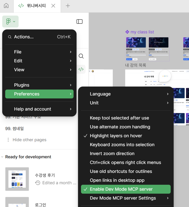 Main menu > Preferences > Enable Dev Mode MCP server체크하여 MCP를 활성화합니다