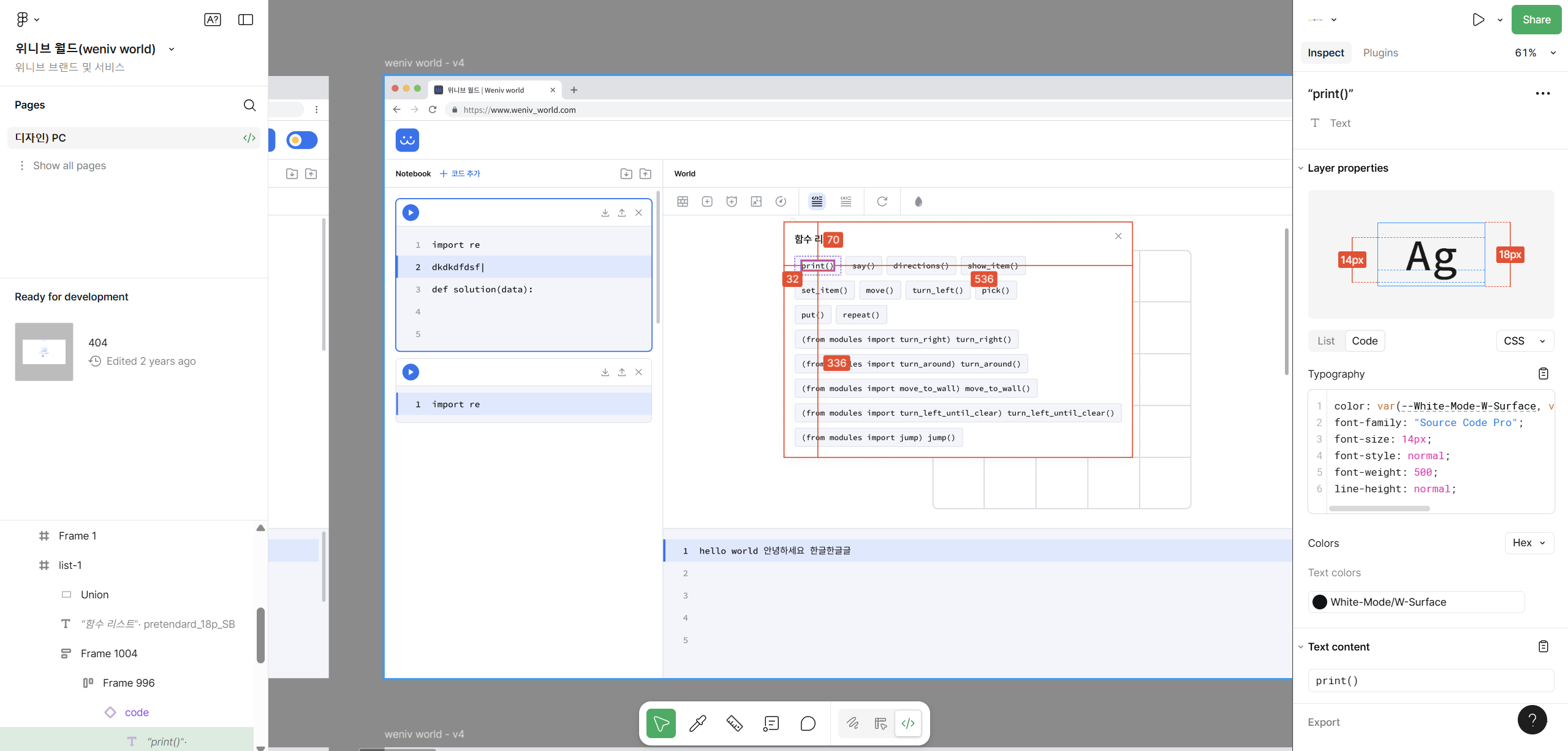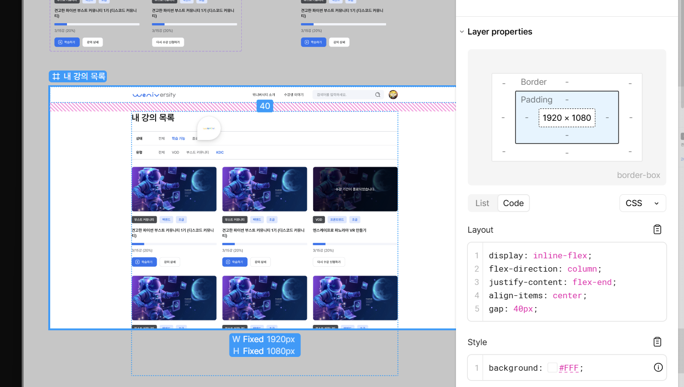 개발자가 디자인을 코드 친화적으로 확인할 수 있는 전용 뷰어입니다. CSS 속성, 간격, 색상 코드 등을 바로 확인할 수 있어 협업에 유용합니다.
