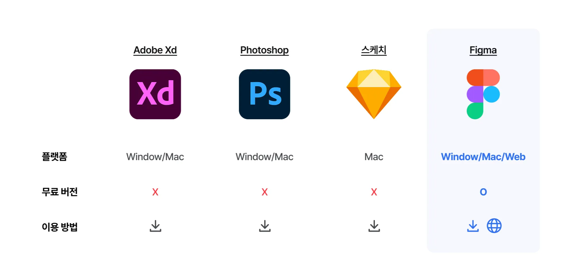 UI/UX 디자인을 만드는 메인 툴입니다. 컴포넌트, 오토 레이아웃, 디자인 시스템을 구축할 수 있습니다.