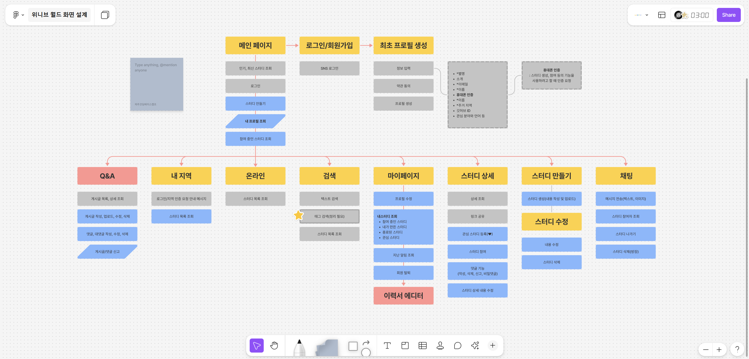 디지털 화이트보드입니다. 브레인스토밍, 플로우차트, 회의록 등 협업 아이디어를 시각적으로 정리할 때 사용합니다.
