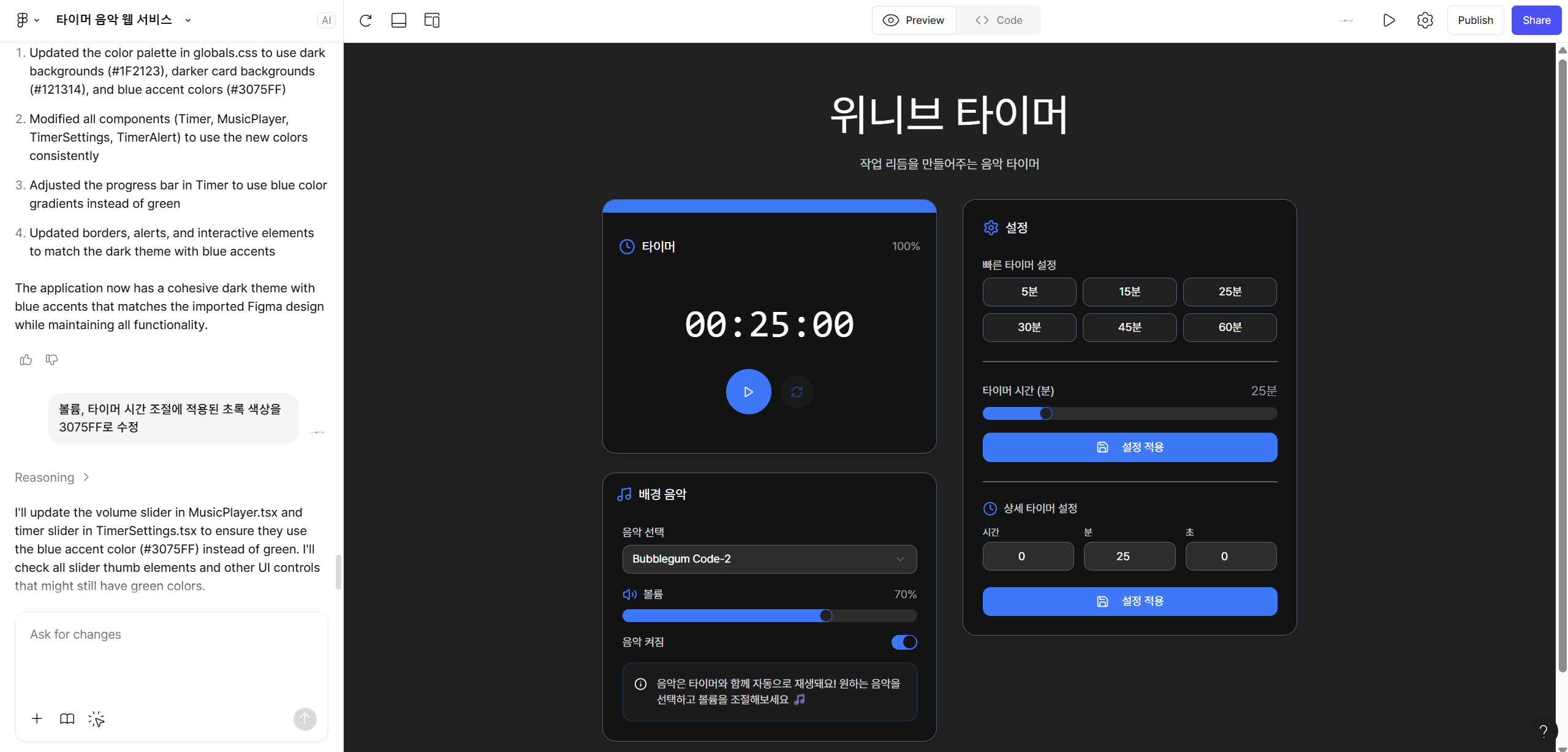 AI가 프롬프트를 받아 디자인과 코드 제안을 생성합니다. 아이디어를 빠르게 시각화하고 프로토타입으로 확장할 수 있습니다.